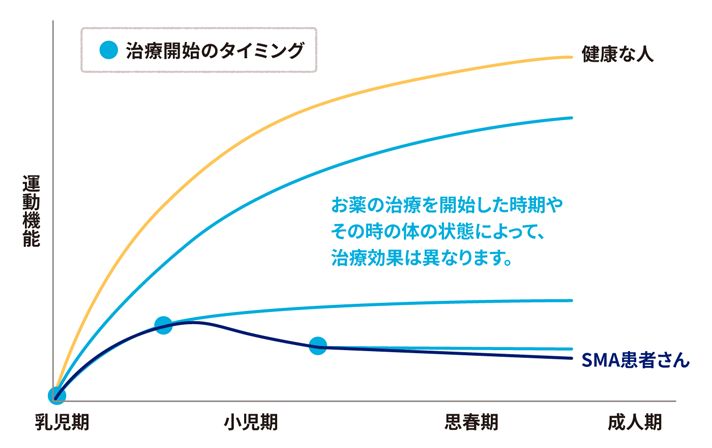 治療薬の効果を最大化するためにも、できるだけ早く治療を始めることが望ましく、新生児スクリーニングをきっかけに発症前から治療を始められた患者さんの中には、健康な人と同じくらいの運動機能を獲得できている方もいらっしゃいます。