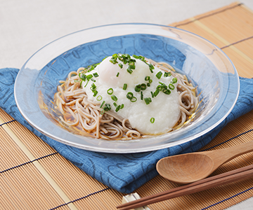 乾麺からつくることで、しっかりとそばの香りを楽しめます。麺をやわらかくする手順が電子レンジ調理なので、家族分からとりわけてつくれるのもポイントです。エネルギーを確保しにくい麺類でも、温泉卵でたんぱく質、とろろでエネルギーを補います。