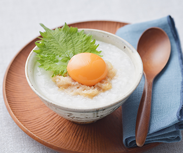 - 器に全がゆを盛って、3の真鯛をのせます。中央に青じそを敷き、その上に卵黄をのせたら出来上がりです。