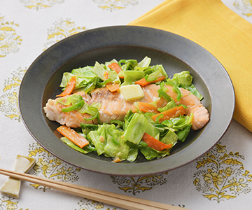 - フライパンにサラダ油を中火で熱し、サーモンを入れてこしょうを振ります。片面に焼き色がついたら裏返し、2の野菜と、混ぜ合わせたみそだれを加えます。