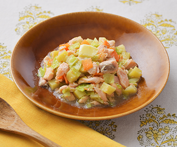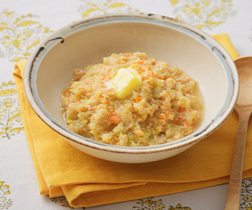 ピーマンをじゃがいもに替えることで歯ぐきでつぶしやすく、エネルギーアップに。野菜は電子レンジで加熱することで、煮込み時間を短縮できます。