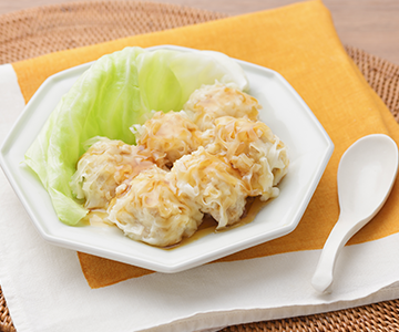シュウマイの皮の代わりに片栗粉をまぶすことで、舌でつぶせるやわらかさに。豚ひき肉をしっかりと練り、豆腐とマヨネーズを加えることでふわふわに仕上がります。肉だねにマヨネーズを加えることでエネルギーアップにもなります。