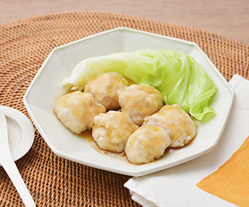 豚ひき肉をしっかりと練り、マヨネーズだけでなく、豆腐も加えることで、よりふわふわとしたやわらかい肉だねになります。少し酸味をきかせたとろみのあるたれで、さっぱりと食べられるだけでなく飲み込みをサポート。